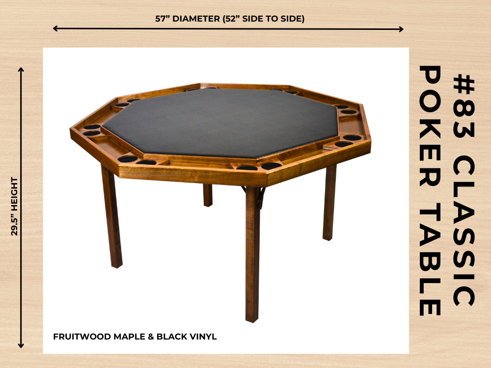 Say goodbye to makeshift game surfaces with Kestell Furniture’s #83 Classic Poker Table, our best-selling standard-size poker table. Proudly made in Wisconsin using American-sourced solid woods—Red Oak or Maple—this 8-player table delivers a bold, timeless design for unforgettable poker nights, board games, or puzzles. Its “Sur-Loc” steel folding legs ensure quick setup and compact storage, solving the problem of limited space. Highly customizable with optional Teflon-coated felt for smooth play or durable vinyl upholstery. Pair with matching wooden folding chairs (sold separately) for a complete setup. Optional service top available (order model FM-57).